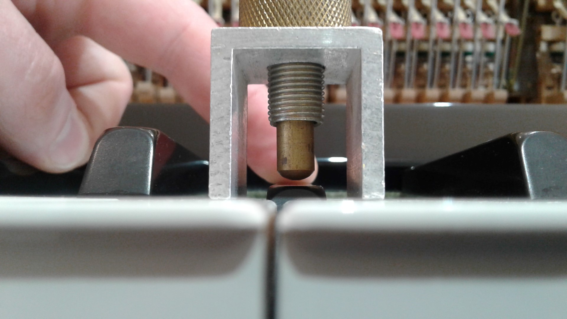 Toutes les touches doivent s’enfoncer à la même profondeur. Le technicien utilise une cale d’enfoncement de la taille souhaité et appuie avec sur les touches blanches . En effleurant le dessus de cale d’enfoncement et la touche adjacente, il sent du bout des doigts si une différence de quelques dixièmes de millimètre existe. Il compense ensuite cette différence en enlevant ou en ajoutant des mouches d’enfoncement sur la pointe d’enfoncement situé sous la touche. Il existe aussi des cales lestées (ref photo). Le technicien a le choix selon sa préférence.