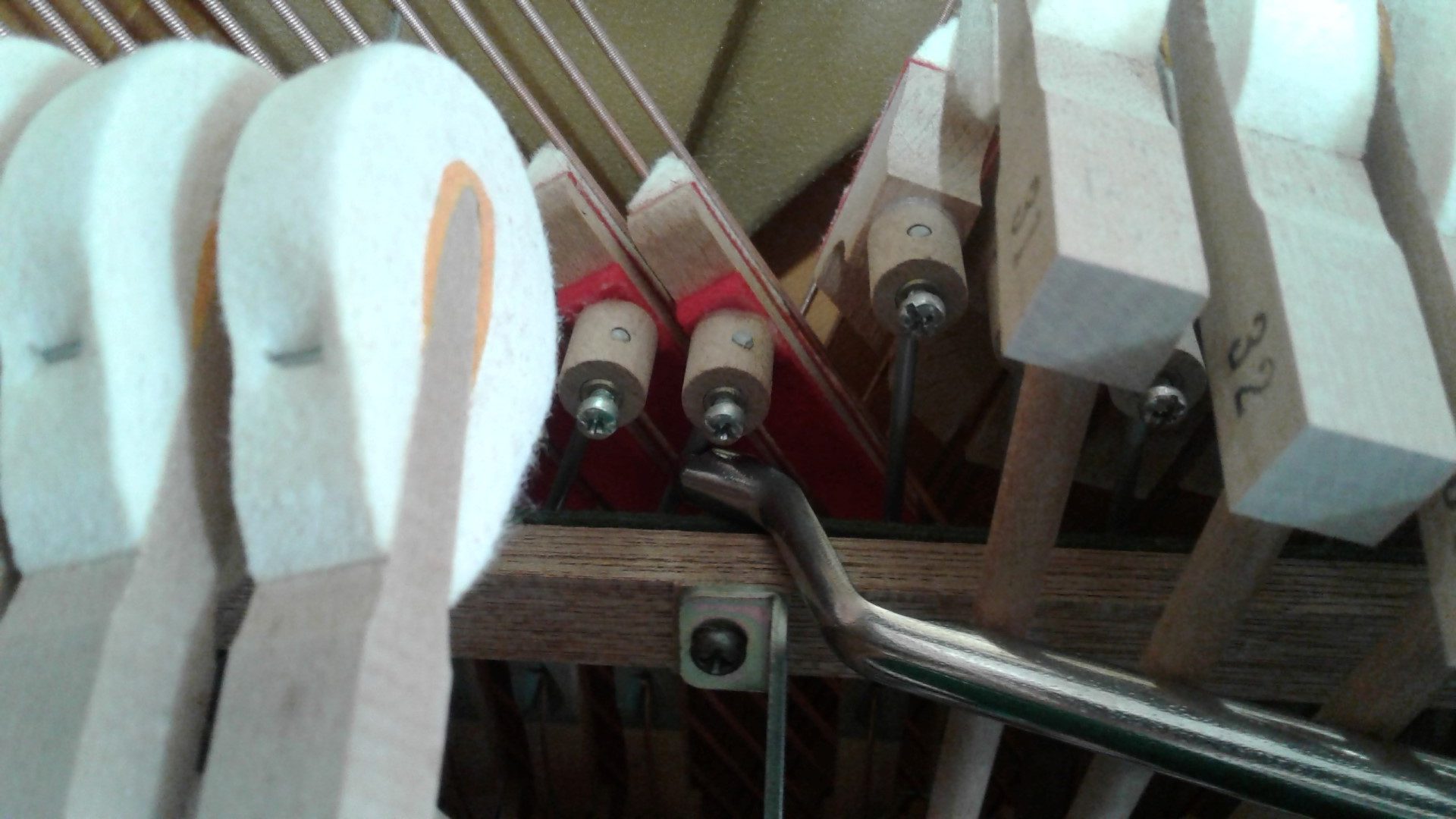 Pour ce faire, le technicien active très doucement la pédale et observe la levée d’étouffoirs, à l’aide d’un outil à couder, il vient plier légèrement les tiges d’étouffoirs afin de les positionner un peu plus en avant ou en arrière pour retarder ou accélérer leur départ. Cette opération est très délicate car une mauvaise manipulation peut rapidement désaxer l’étouffoirs dans une position ou il ne fonctionne plus correctement.